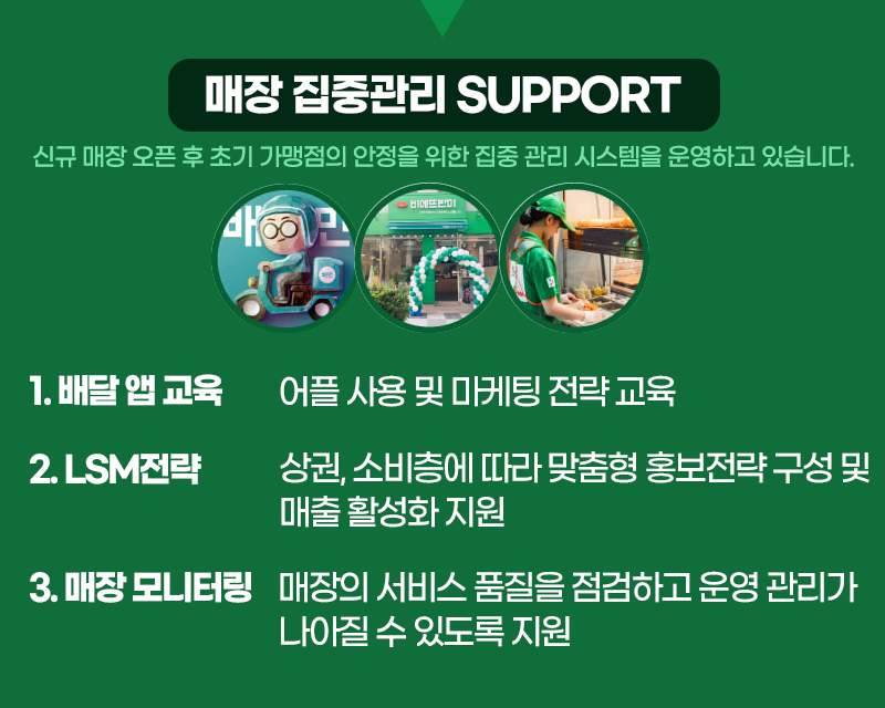 신규 매장 오픈 후 초기 가맹점의 안정을 위한 집중 관리 시스템을 운영하고 있습니다.
