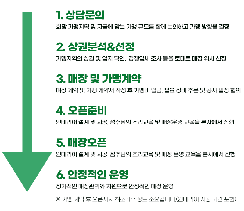 매장 계약 및 가맹 계약서 작성 후 가맹비 입금, 필요 장비 주문 및 공사 일정 협의